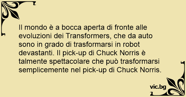 Il mondo è a bocca aperta di fronte alle evoluzioni dei Transformers, che da auto sono in grado di trasformarsi in robot devastanti. Il pick-up di Chuck Norris è talmente spettacolare che può trasformarsi semplicemente nel pick-up di Chuck Norris.
