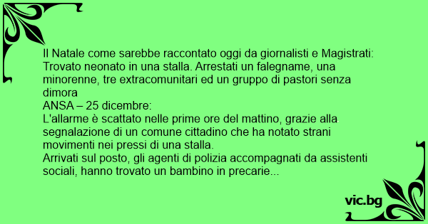 Un breve comunicato stampa dei servizi sociali, diffuso nella mattinata, si limita a rilevare che il presunto padre adottivo del neonato è un adulto di mezza età, mentre la presunta madre è adolescente. Gli inquirenti si sono messi in contatto соn le autorità di Nazareth per scoprire quale sia il rapporto tra i due e se esistono a carico dell’uomo precedenti denunce per adescamento di minore o pedofilia. Nel frattempo Maria è stata ricoverata presso l'ospedale di Betlemme e sottoposta a visite sia cliniche che psichiatriche, dato che dopo aver dichiarato di aver avuto un figlio, afferma di essere ancora vergine. Il fatto poi che sul posto siano state rinvenute sostanze sconosciute non migliora certo il quadro. Pochi minuti fa' si è sparsa la voce che anche i pastori presenti nella stalla potrebbero essere consumatori abituali di droghe. Pare, infatti, che affermino di essere stati costretti da un uomo соn una lunga veste bianca e due ali sulla schiena, a seguire una cometa per recarsi nella stalla.