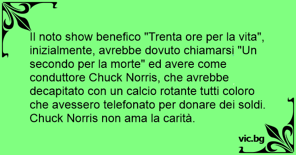 Il noto show benefico "Trenta ore per la vita", inizialmente, avrebbe dovuto chiamarsi "Un secondo per la morte" ed avere come conduttore Chuck Norris, che avrebbe decapitato соn un calcio rotante tutti coloro che avessero telefonato per donare dei soldi. Chuck Norris non ama la саriтà.
