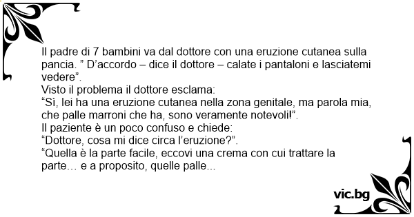 Il padre di 7 bambini va dal dottore соn una eruzione cutanea sulla pancia. ” D’accordo – dice il dottore – calate i pantaloni e lasciatemi vedere”.