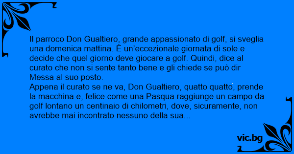 Appena il curato se ne va, Don Gualtiero, quatto quatto, prende la macchina e, felice come una Pasqua raggiunge un campo da golf lontano un centinaio di chilometri, dove, sicuramente, non avrebbe mai incontrato nessuno della sua parrocchia.