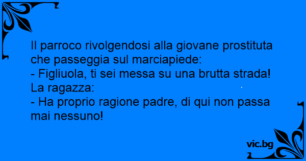 Свещеник се обръща към младата проститутка, която върви по тротоара: - Дъще, по лош път път си поела! - Прав си отче, никой не минава оттук!