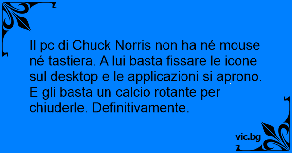 Il pc di Chuck Norris non ha né mouse né tastiera. A lui basta fissare le icone sul desktop e le applicazioni si aprono. E gli basta un calcio rotante per chiuderle. Definitivamente.