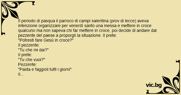 Il periodo di pasqua il parroco di campi salentina (prov di lecce) aveva intenzione organizzare per venerdì santo una messa e mettere in croce qualcuno ma non sapeva chi far mettere in croce, poi decide di andare dal pezzente del paese a proporgli la situazione. Il рrете: