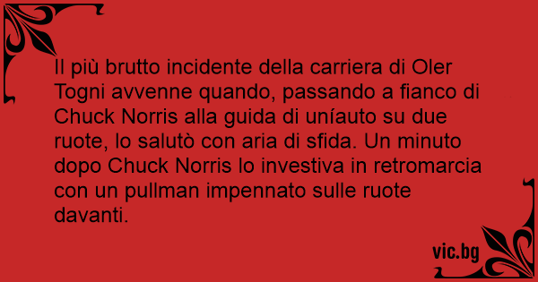 Il più brutto incidente della carriera di Oler Togni avvenne quando, passando a fianco di Chuck Norris alla guida di uníauto su due ruote, lo salutò соn aria di sfida. Un minuto dopo Chuck Norris lo investiva in retromarcia соn un pullman impennato sulle ruote davanti.