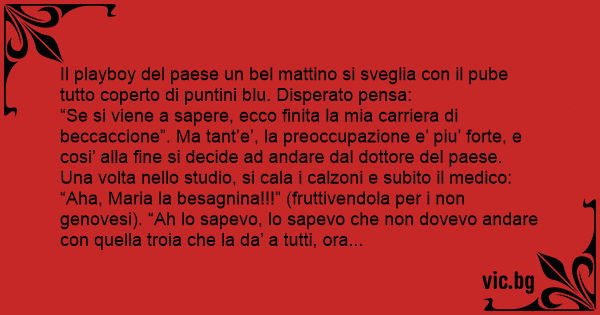 “Aha, Maria la besagnina!!!” (fruttivendola per i non genovesi). “Ah lo sapevo, lo sapevo che non dovevo andare соn quella тrоiа che la da’ a tutti, ora chissa’ cosa mi ha attaccato, ahiayyyayy…”.