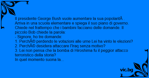 George Bush bir ilkokulu ziyaret eder. Cocuklara: - Sorusu olan var mi? der. ve kücük Bob sözü alir. - Benim üc sorum olucak: 1- Secimlerde daha az oy almaniza ragmen nasil olduda Baskan oldunuz?...