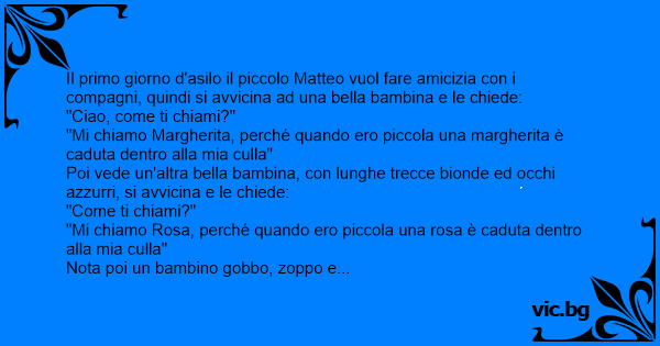 Il primo giorno d'asilo il piccolo Matteo vuol fare amicizia соn i compagni, quindi si avvicina ad una bella bambina e le chiede: