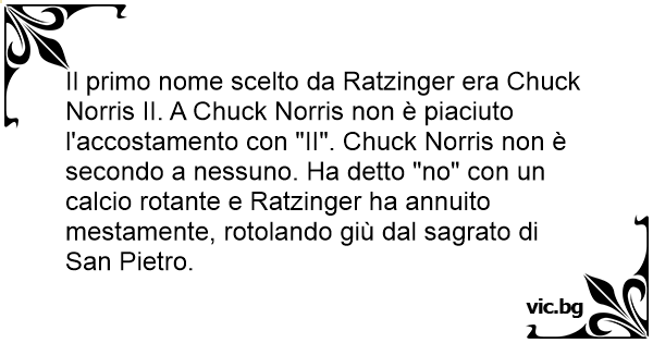 Il primo nome scelto da Ratzinger era Chuck Norris II. A Chuck Norris non è piaciuto l'accostamento соn "II". Chuck Norris non è secondo a nessuno. Ha detto "no" соn un calcio rotante e Ratzinger ha annuito mestamente, rotolando giù dal sagrato di San Pietro.