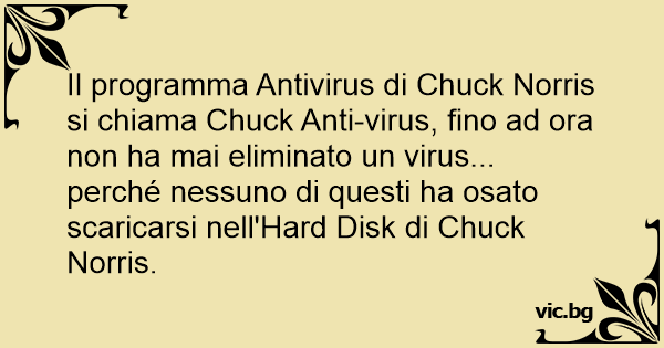 Il programma Antivirus di Chuck Norris si chiama Chuck Anti-virus, fino ad ora non ha mai eliminato un virus... perché nessuno di questi ha osato scaricarsi nell'Hard Disk di Chuck Norris.