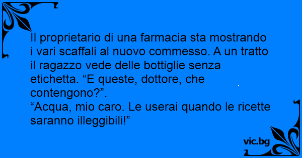 Il proprietario di una farmacia sta mostrando i vari scaffali al nuovo commesso. A un tratto il ragazzo vede delle bottiglie senza etichetta. “E queste, dottore, che contengono?”.