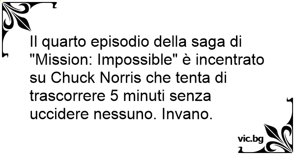 Il quarto episodio della saga di "Mission: Impossible" è incentrato su Chuck Norris che tenta di trascorrere 5 minuti senza uccidere nessuno. Invano.