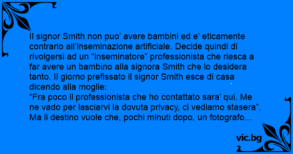Il signor Smith non puo’ avere bambini ed e’ eticamente contrario all’inseminazione artificiale. Decide quindi di rivolgersi ad un “inseminatore” professionista che riesca a far avere un bambino alla signora Smith che lo desidera tanto. Il giorno prefissato il signor Smith esce di casa dicendo alla moglie: