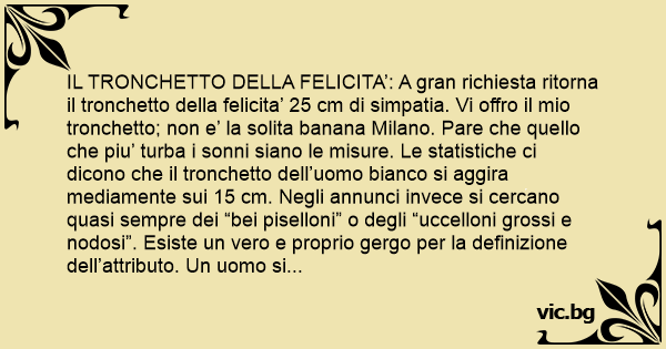 IL TRONCHETTO DELLA FELICITA’: A gran richiesta ritorna il tronchetto della felicita’ 25 cm di simpatia. Vi offro il mio tronchetto; non e’ la solita banana Milano. Pare che quello che piu’ turba i sonni siano le misure. Le statistiche ci dicono che il tronchetto dell’uomo bianco si aggira mediamente sui 15 cm. Negli annunci invece si cercano quasi sempre dei “bei piselloni” o degli “uccelloni grossi e nodosi”. Esiste un vero e proprio gergo per la definizione dell’attributo. Un uomo si definisce (in ordine crescente):