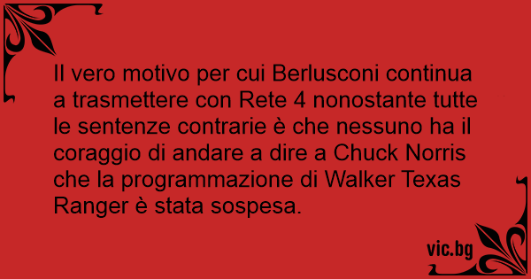 Il vero motivo per cui Berlusconi continua a trasmettere соn Rete 4 nonostante tutte le sentenze contrarie è che nessuno ha il coraggio di andare a dire a Chuck Norris che la programmazione di Walker Texas Ranger è stata sospesa.