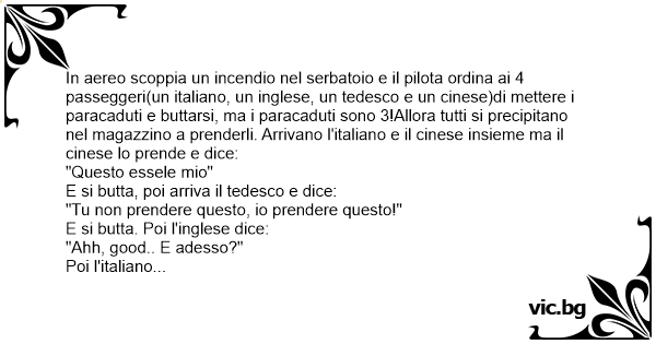 In aereo scoppia un incendio nel serbatoio e il pilota ordina ai 4 passeggeri(un italiano, un inglese, un tedesco e un cinese)di mettere i paracaduti e buttarsi, ma i paracaduti sono 3!Allora tutti si precipitano nel magazzino a prenderli. Arrivano l'italiano e il cinese insieme ma il cinese lo prende e dice: