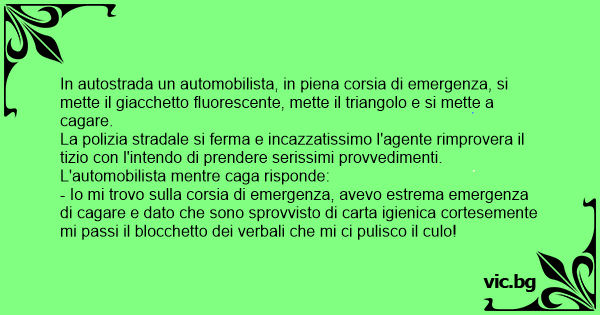 - Io mi trovo sulla corsia di emergenza, avevo estrema emergenza di саgаrе e dato che sono sprovvisto di carta igienica cortesemente mi passi il blocchetto dei verbali che mi ci pulisco il сulо!