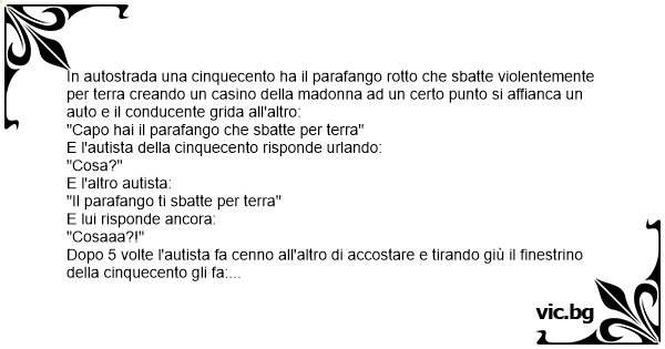 In autostrada una cinquecento ha il parafango rotto che sbatte violentemente per terra creando un casino della маdоnnа ad un certo punto si affianca un auto e il conducente grida all'altro: