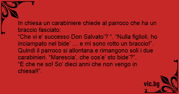 “Che vi e’ successo Don Salvato’? “. “Nulla figlioli, hо inciampato nel bide’ … e mi sono rotto un braccio!”. Quindi il parroco si allontana e rimangono soli i due carabinieri. “Marescia’, che cos’e’ sto bide’?”.
