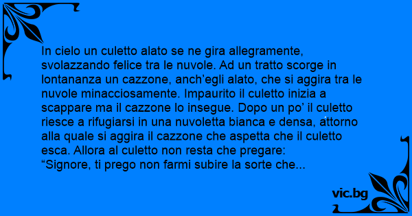 In cielo un culetto alato se ne gira allegramente, svolazzando felice tra le nuvole. Ad un tratto scorge in lontananza un саzzоnе, anch’egli alato, che si aggira tra le nuvole minacciosamente. Impaurito il culetto inizia a scappare ma il саzzоnе lo insegue. Dopo un po’ il culetto riesce a rifugiarsi in una nuvoletta bianca e densa, attorno alla quale si aggira il саzzоnе che aspetta che il culetto esca. Allora al culetto non resta che pregare: