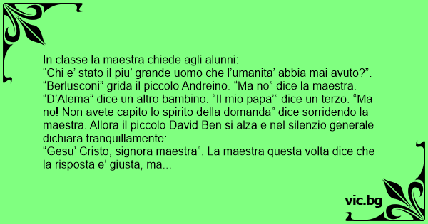 “Berlusconi” grida il piccolo Andreino. “Ma no” dice la maestra. “D’Alema” dice un altro bambino. “Il mio papa’” dice un terzo. “Ma no! Non avete capito lo spirito della domanda” dice sorridendo la maestra. Allora il piccolo David Ben si alza e nel silenzio generale dichiara tranquillamente: