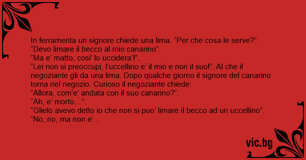“Lei non si preoccupi, l’uccellino e’ il mio e non il suo!”. Al che il negoziante gli da una lima. Dopo qualche giorno il signore del canarino torna nel negozio. Curioso il negoziante chiede: