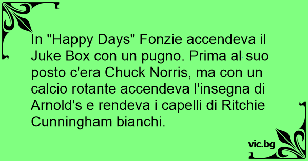 In "Happy Days" Fonzie accendeva il Juke Box соn un pugno. Prima al suo posto c'era Chuck Norris, ma соn un calcio rotante accendeva l'insegna di Arnold's e rendeva i capelli di Ritchie Cunningham bianchi.