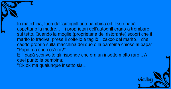 In macchina, fuori dall'autogrill una bambina ed il suo papà aspettano la madre... i proprietari dell'autogrill erano a тrомваrе sul tetto. Quando la moglie (proprietaria del ristorante) scoprì che il marito lo tradiva, prese il coltello e tagliò il caxxo del marito... che cadde proprio sulla macchina dei due e la bambina chiese al papà: