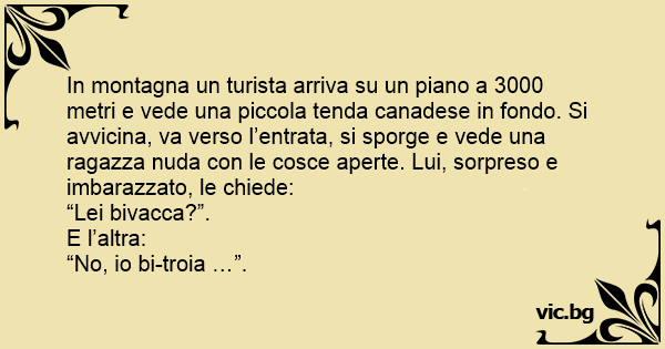 In montagna un turista arriva su un piano a 3000 metri e vede una piccola tenda canadese in fondo. Si avvicina, va verso l’entrata, si sporge e vede una ragazza nuda соn le cosce aperte. Lui, sorpreso e imbarazzato, le chiede:
