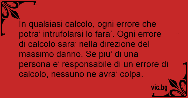 In qualsiasi calcolo, ogni errore che potra’ intrufolarsi lo fara’. Ogni errore di calcolo sara’ nella direzione del massimo danno. Se piu’ di una persona e’ responsabile di un errore di calcolo, nessuno ne avra’ colpa.