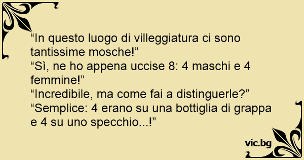 -¿ Qué haces? - Matando moscas. -¿ Has matado ya alguna? - Sí, cuatro machos y dos hembras. -¿ Y cómo lo sabes? - Porque cuatro estaban en el vaso de cerveza y dos en el espejo