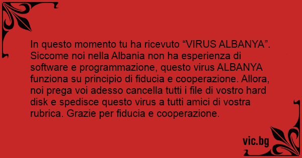 In questo momento tu ha ricevuto “VIRUS ALBANYA”. Siccome noi nella Albania non ha esperienza di software e programmazione, questo virus ALBANYA funziona su principio di fiducia e cooperazione. Allora, noi prega voi adesso cancella tutti i file di vostro hard disk e spedisce questo virus a tutti amici di vostra rubrica. Grazie per fiducia e cooperazione.