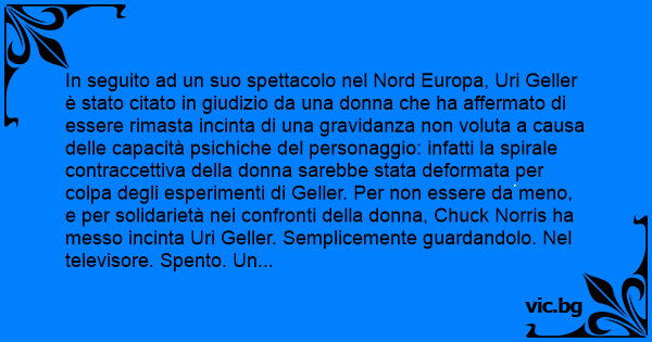 In seguito ad un suo spettacolo nel Nord Europa, Uri Geller è stato citato in giudizio da una donna che ha affermato di essere rimasta incinta di una gravidanza non voluta a causa delle capacità psichiche del personaggio: infatti la spirale contraccettiva della donna sarebbe stata deformata per colpa degli esperimenti di Geller. Per non essere da meno, e per solidarietà nei confronti della donna, Chuck Norris ha messo incinta Uri Geller. Semplicemente guardandolo. Nel televisore. Spento. Un anno prima.