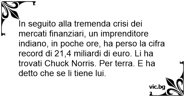 In seguito alla tremenda crisi dei mercati finanziari, un imprenditore indiano, in poche ore, ha perso la cifra record di 21,4 miliardi di euro. Li ha trovati Chuck Norris. Per terra. E ha detto che se li tiene lui.