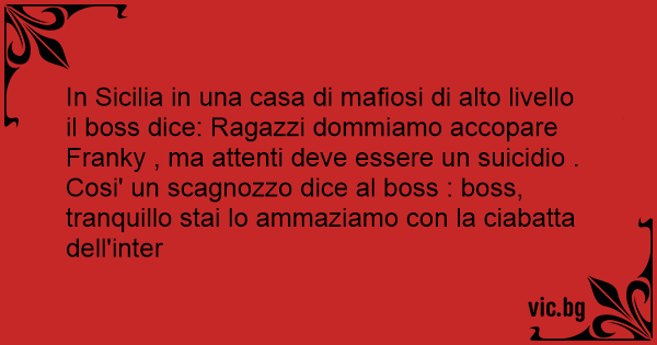 In Sicilia in una casa di mafiosi di alto livello il boss dice: Ragazzi dommiamo accopare Franky , ma attenti deve essere un suicidio .