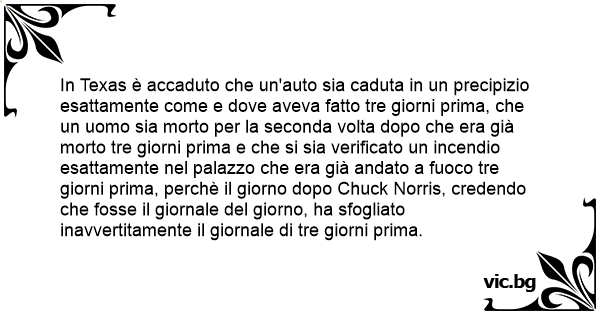 In Texas è accaduto che un'auto sia caduta in un precipizio esattamente come e dove aveva fatto tre giorni prima, che un uomo sia morto per la seconda volta dopo che era già morto tre giorni prima e che si sia verificato un incendio esattamente nel palazzo che era già andato a fuoco tre giorni prima, perchè il giorno dopo Chuck Norris, credendo che fosse il giornale del giorno, ha sfogliato inavvertitamente il giornale di tre giorni prima.