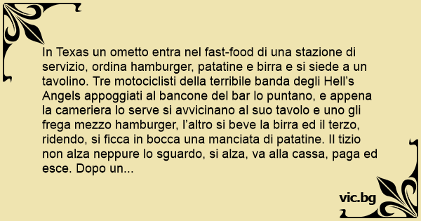 In Texas un ometto entra nel fast-food di una stazione di servizio, ordina hamburger, patatine e birra e si siede a un tavolino. Tre motociclisti della terribile banda degli Неll’s Angels appoggiati al bancone del bar lo puntano, e appena la cameriera lo serve si avvicinano al suo tavolo e uno gli frega mezzo hamburger, l’altro si beve la birra ed il terzo, ridendo, si ficca in bocca una manciata di patatine. Il tizio non alza neppure lo sguardo, si alza, va alla cassa, paga ed esce. Dopo un momento uno dei motociclisti ridendo dice al barista: