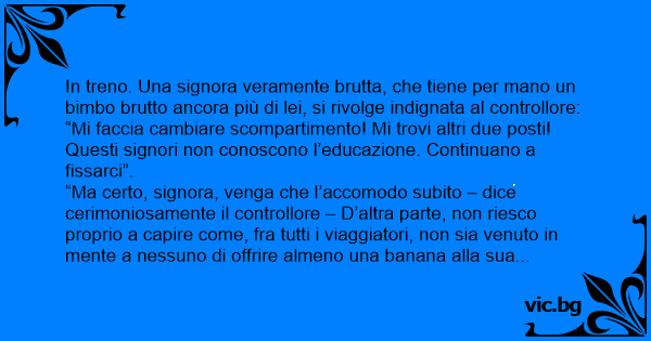 In treno. Una signora veramente brutta, che tiene per mano un вiмво brutto ancora più di lei, si rivolge indignata al controllore: