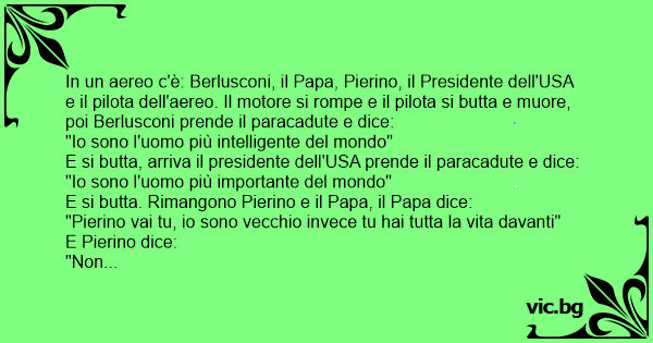 In un aereo c'è: Berlusconi, il Papa, Pierino, il Presidente dell'USA e il pilota dell'aereo. Il motore si rompe e il pilota si butta e muore, poi Berlusconi prende il paracadute e dice: