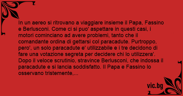 In un aereo si ritrovano a viaggiare insieme il Papa, Fassino e Berlusconi. Come ci si puo' aspettare in questi casi, i motori cominciano ad avere problemi, tanto che il comandante ordina di gettarsi col paracadute. Purtroppo, pero', un solo paracadute e' utilizzabile e i tre decidono di fare una votazione segreta per decidere chi lo utilizzera'. Dopo il veloce scrutinio, stravince Berlusconi, che indossa il paracadute e si lancia soddisfatto. Il Papa e Fassino lo osservano tristemente, allora il Papa si scuote e dice: