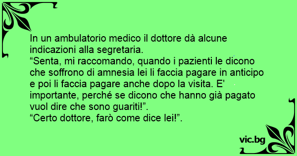 “Senta, mi raccomando, quando i pazienti le dicono che soffrono di amnesia lei li faccia pagare in anticipo e poi li faccia pagare anche dopo la visita. E' importante, perché se dicono che hanno già pagato vuol dire che sono guariti!”.