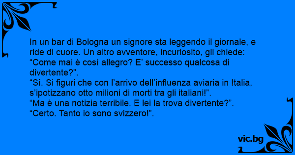 In un bar di Bologna un signore sta leggendo il giornale, e ride di cuore. Un altro avventore, incuriosito, gli chiede:
