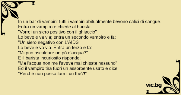In un bar di vampiri: tutti i vampiri abitualmente bevono calici di sangue. Entra un vampiro e chiede al barista: