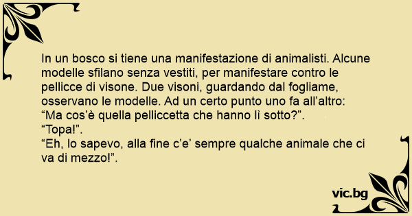In un bosco si tiene una manifestazione di animalisti. Alcune modelle sfilano senza vestiti, per manifestare contro le pellicce di visone. Due visoni, guardando dal fogliame, osservano le modelle. Ad un certo punto uno fa all’altro: