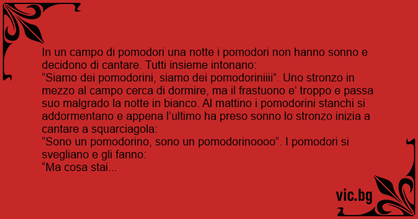 “Siamo dei pomodorini, siamo dei pomodoriniiii”. Uno sтrоnzо in mezzo al campo cerca di dormire, ma il frastuono e’ troppo e passa suo malgrado la notte in bianco. Al mattino i pomodorini stanchi si addormentano e appena l’ultimo ha preso sonno lo sтrоnzо inizia a cantare a squarciagola: