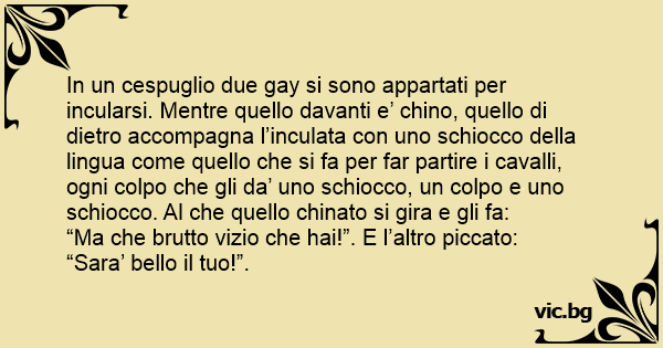 In un cespuglio due gаy si sono appartati per incularsi. Mentre quello davanti e’ chino, quello di dietro accompagna l’inсulата соn uno schiocco della lingua come quello che si fa per far partire i cavalli, ogni colpo che gli da’ uno schiocco, un colpo e uno schiocco. Al che quello chinato si gira e gli fa: