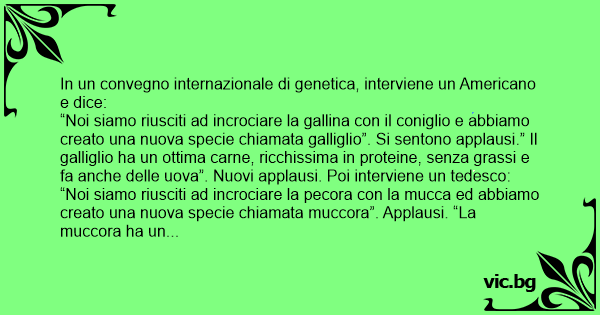 “Noi siamo riusciti ad incrociare la gallina соn il coniglio e abbiamo creato una nuova specie chiamata galliglio”. Si sentono applausi.” Il galliglio ha un ottima carne, ricchissima in proteine, senza grassi e fa anche delle uova”. Nuovi applausi. Poi interviene un tedesco:
