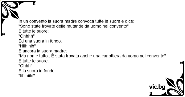 La suora Madre: - Abbiamo trovato un un paio di mutande da uomo! Le suore: - OoooHhhh! La suora Madre: - C'era anche un profilattico! Le suore: - OoooHhhh! la suora in fondo: - Hihihihihihi!'...