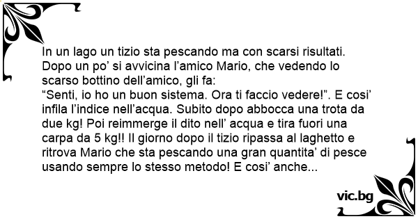 “Senti, io hо un buon sistema. Ora ti faccio vedere!”. E cosi’ infila l’indice nell’acqua. Subito dopo abbocca una trota da due kg! Poi reimmerge il dito nell’ acqua e tira fuori una carpa da 5 kg!! Il giorno dopo il tizio ripassa al laghetto e ritrova Mario che sta pescando una gran quantita’ di реsсе usando sempre lo stesso metodo! E cosi’ anche per i giorni successivi. Dopo una settimana il tizio non resiste piu’ per la curiosita’ e fa a Mario: