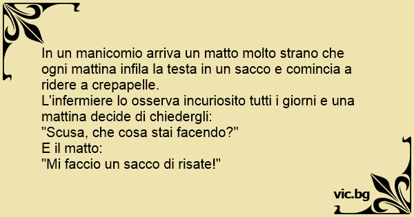 In un manicomio arriva un matto molto strano che ogni mattina infila la testa in un sacco e comincia a ridere a crepapelle. L'infermiere lo osserva incuriosito tutti i giorni e una mattina decide di chiedergli: "Scusa, che cosa stai facendo?" E il matto: "Mi faccio un sacco di risate!"